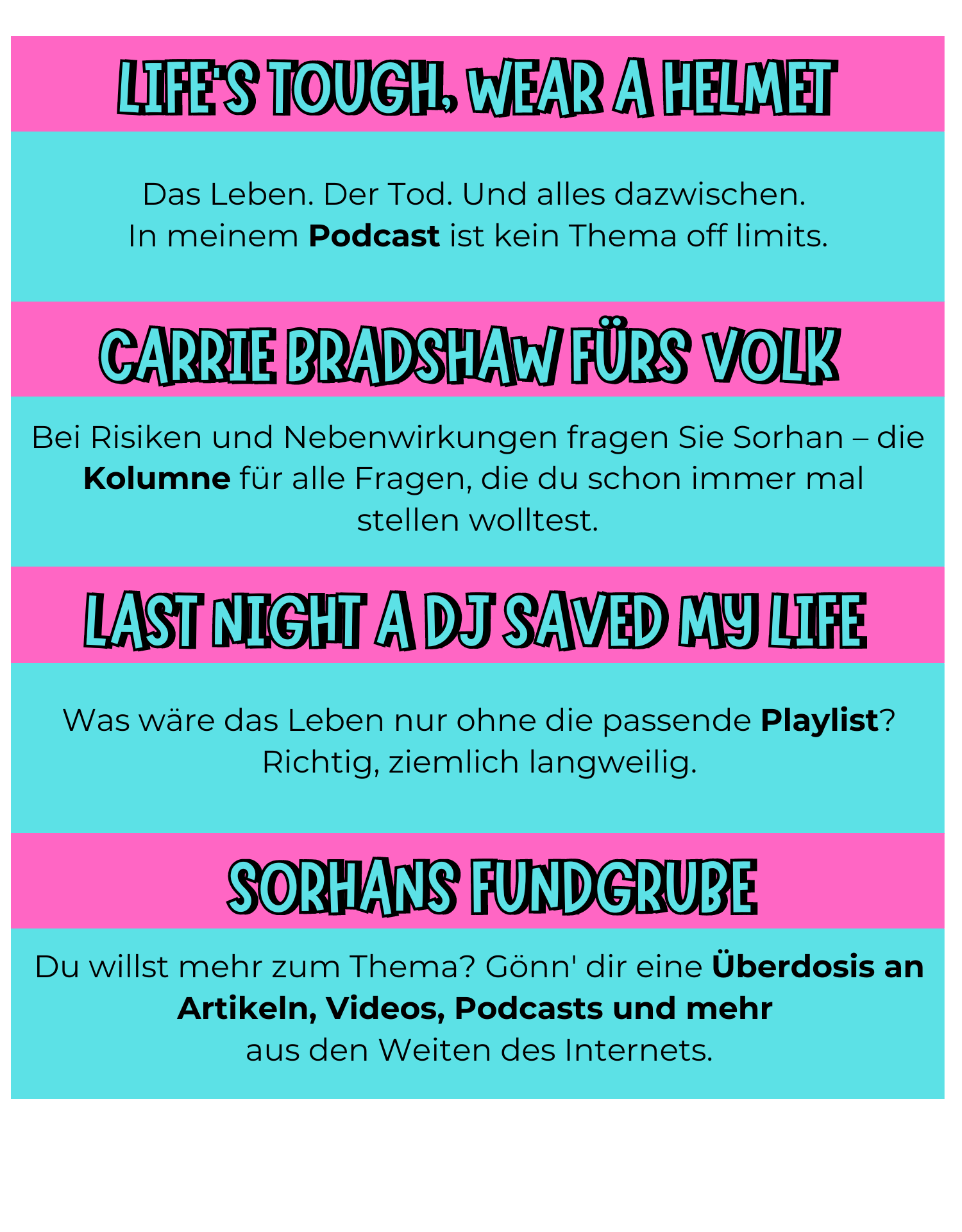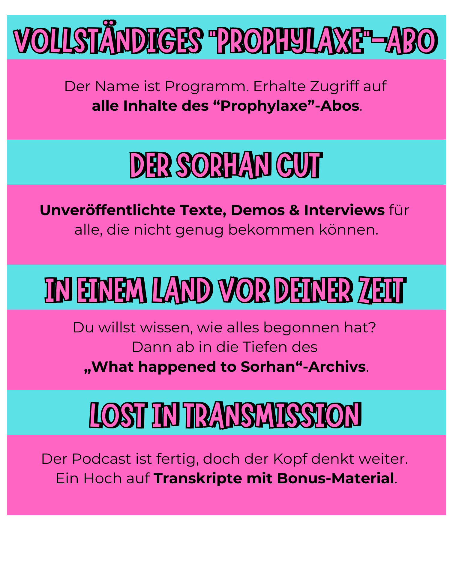 Ob du dir die volle Newsletter-Dröhnung (“Prophylaxe”-Abo) gönnst oder ausgiebig alle Extras genießt (“Volle Dosis”-Abo) - ein Sorhan im Leben ist besser als keiner.